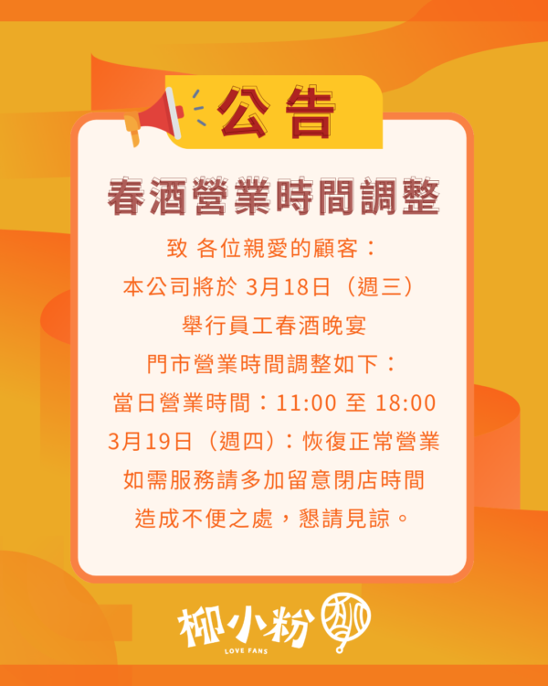 春酒營業時間調整公告 📢